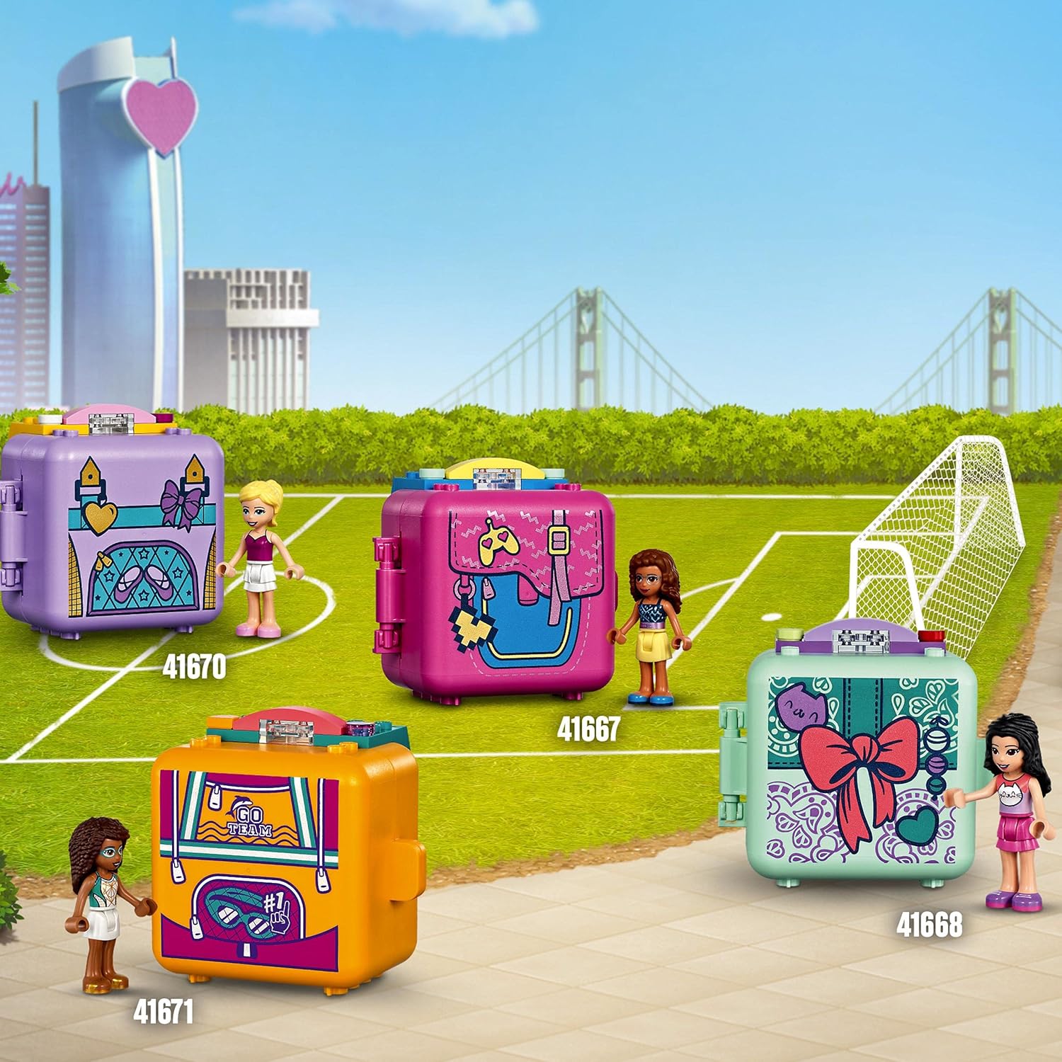 - The collectable toy for sports enthusiasts children includes the LEGO Mini doll Mia and a dog figure as well as a scoreboard, ball and trophy